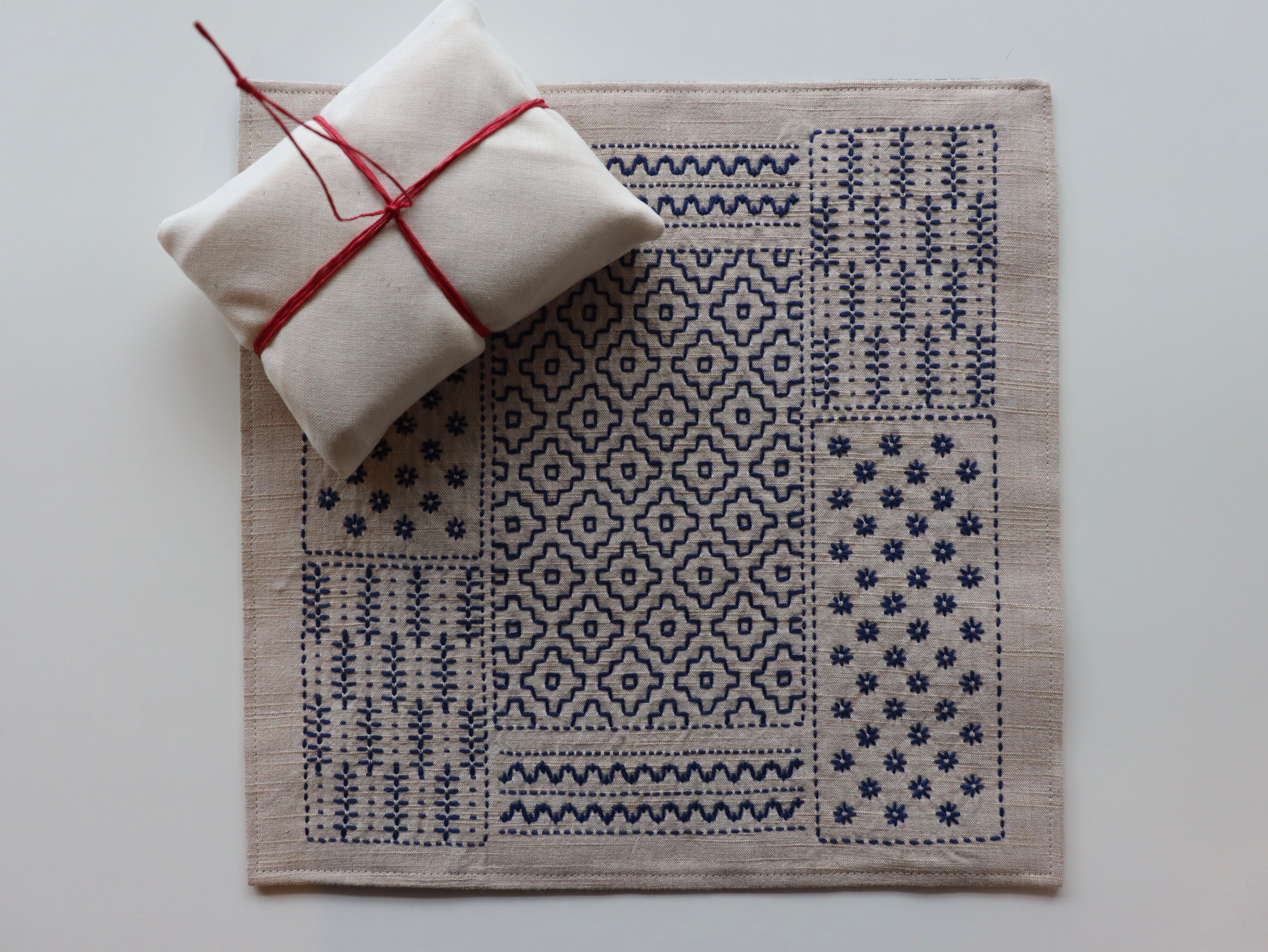 日本の伝統工芸『長井さしこ』をどなたでも気軽に刺せるよう、そして長井さしこのこだわりの一つでもある、角がしっかりと出て仕立てられるように工夫したわかりやすいレシピ付き
