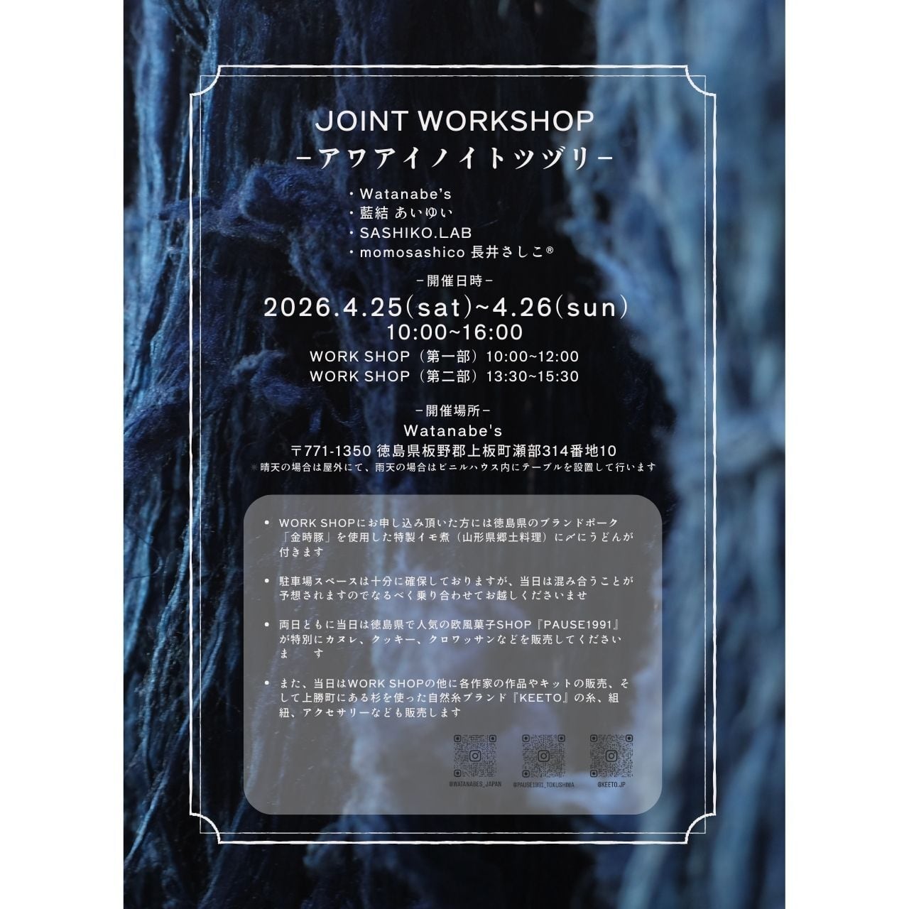 その「阿波藍」を土つくりから藍の栽培、葉藍の収穫・乾燥、蒅(すくも)づくり、さらに染色液の仕込みから染色に至る全ての工程を一貫して行われている国内唯一の工房『Watanabe`s』の敷地をお借りして、今回は東京からmomosashico 長井さしこ®︎、京都からSASHIKO.LAB、そして徳島から藍結 あいゆいの3作家による阿波藍の糸や生地を使用したスペシャルなJOINT WORKSHOPが開催されます!