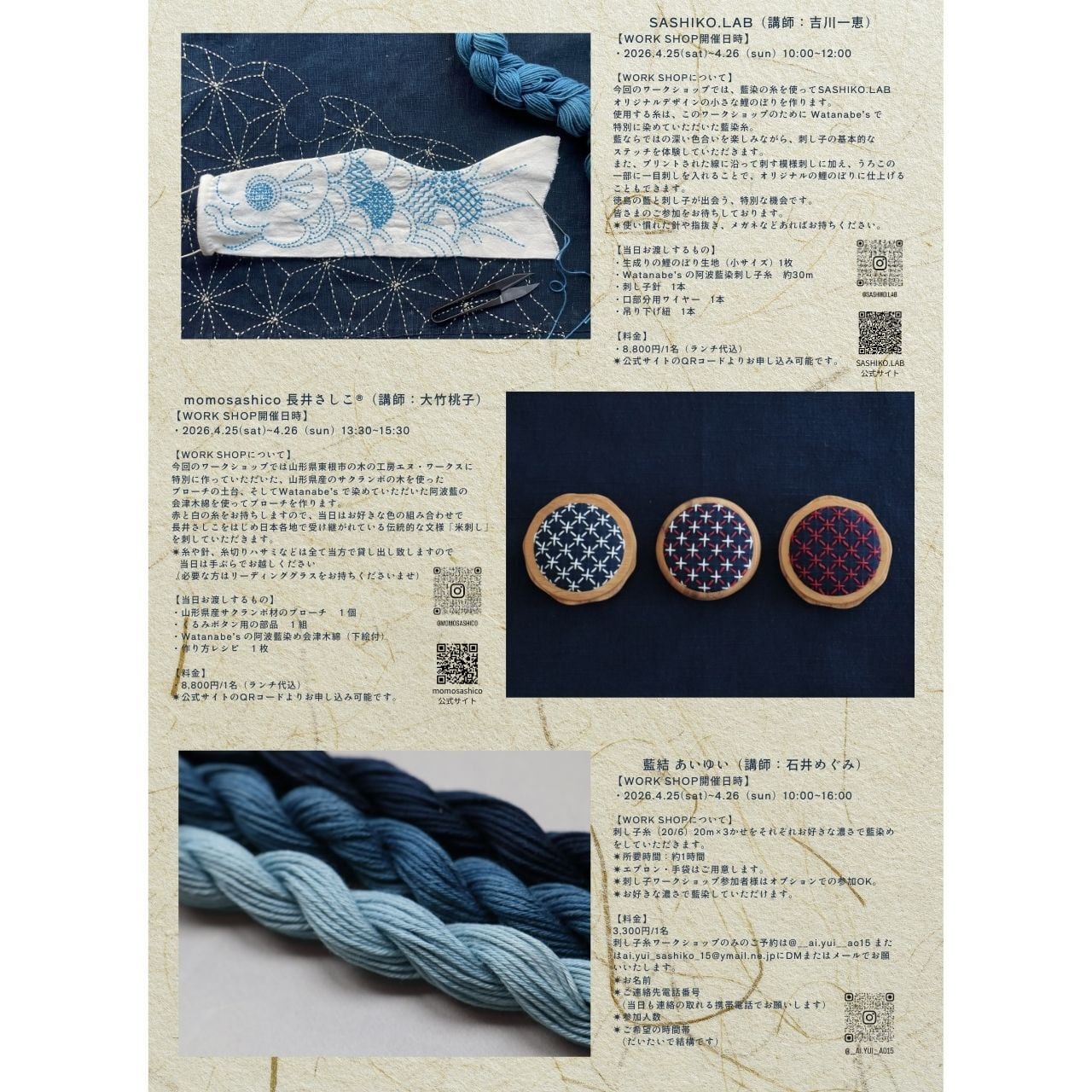 その「阿波藍」を土つくりから藍の栽培、葉藍の収穫・乾燥、蒅(すくも)づくり、さらに染色液の仕込みから染色に至る全ての工程を一貫して行われている国内唯一の工房『Watanabe`s』の敷地をお借りして、今回は東京からmomosashico 長井さしこ®︎、京都からSASHIKO.LAB、そして徳島から藍結 あいゆいの3作家による阿波藍の糸や生地を使用したスペシャルなJOINT WORKSHOPが開催されます!